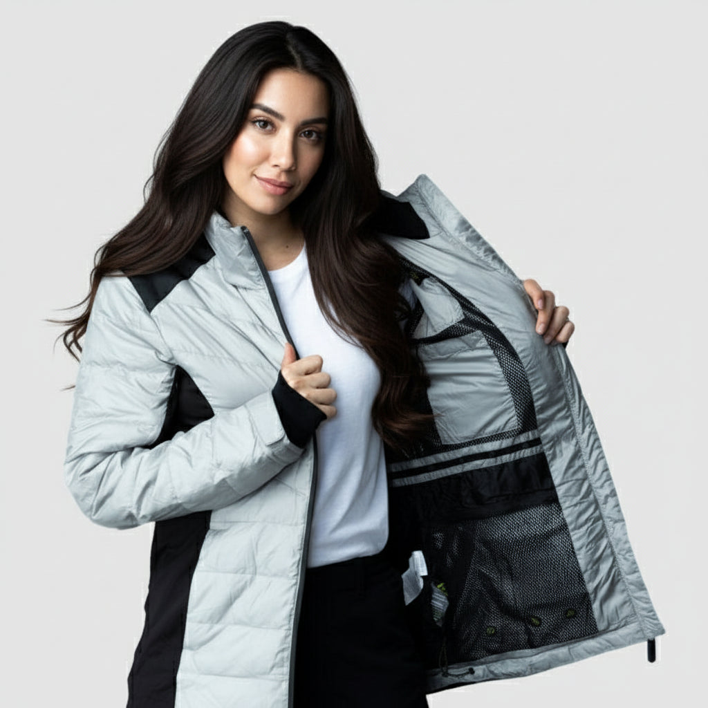 The EcoDown Jacket in grey represents a new standard in responsible outerwear. Built with a 100% recycled polyester RipStop shell, this jacket delivers the durability and tear resistance you need without environmental compromise. The synthetic down insulation—sourced from recycled plastic bottles—provides genuine warmth retention while keeping weight to a minimum, making it ideal for layering or standalone wear.